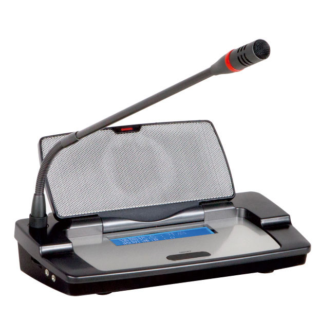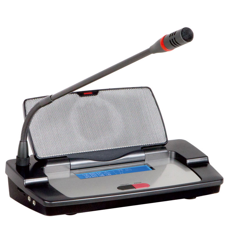 ◆ 具有可插拔式鵝頸可繞性麥克風桿,并具有發言指示燈環; ◆ 單元由系統主機供電。輸入電壓為DC24V,屬于安全范圍; ◆ 具兩組3.5mm立體聲輸出插座,可作錄音及連接MIC用; ◆ 單元具有8芯插座用子系統“T”型連接;內置高保真揚聲器及外接耳機插孔; ◆ 可繞式電容麥克風,并配可更換式防風罩; ◆ 話筒桿具有加長型可供選擇;麥克風具有雙色燈環; ◆ 系統中主席單元不受限制,并可置回路中任何位置; ◆ 具有一組輸出插孔和一組無線MIC輸入插孔(可選項); ◆ 具有強制切斷代表單元麥克風發言的優先功能和主席優先的提示音; ◆ 具有主席專有模式:主席按PRIO鍵關閉發言狀態的代表單體后,所有代表單元不能在開啟,直至該主席單元結束發言關閉麥克風; ◆ 內建高品質喇叭(當麥克風開啟時,喇叭自動靜音); ◆ 內含會議麥克風單元連接線; ◆ 符合國際會議設備電器認證標準(IEC60914)及國際安規標準UL或CE認證; ◆ 頻率響應:80Hz~16kHz;靈敏度:-44dB±2dB; ◆ 咪桿長度:390mm;外觀尺寸:207mmX117mmX60mm;參考講話距離:15cm~50cm;凈重:1kg