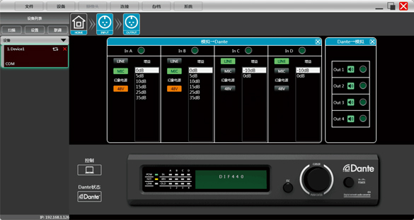 Dante數字網絡音頻技術是基于千兆以太網網絡傳輸的無壓縮、專業級的數字音頻傳輸技術(AoIP)。Dante技術在音頻系統中支持數字音頻信號網絡傳輸的設備甚至可達數十臺甚至上百臺,實現設備之前的數字信號互聯互通,并具有穩定可靠的信號同步等功能。Dante網絡音頻接口盒可實現模擬音頻信號接入,轉換為數字音頻信號通過Dante協議接入到任意的Dante音頻傳輸網絡設備中,實現高品質。 ■遠距離、低延時的傳輸特性。 ■4路音頻平衡輸入4路音頻平衡輸出 ■拓撲方式靈活,支持擴展大批量發射端和接收端 ■采樣頻率24bit-44.1k/48k/96k ■MIC-48V/MIC/12dBu/22dBu四檔靈敏度可選 ■總諧波失真:〈0.005% ■信噪比:>92dB (-20dBu@1KHz) ■動態范圍:>92dB (-12dBu@1KHz) ■底噪:<-92dBu(MIC/48V:-81dBu) ■工作電壓:DC12V;工作電流:800mA ■頻率響應:20Hz-20KHz@±0.3dB((MIC/48V:20Hz-20KHz@±1.5dB)