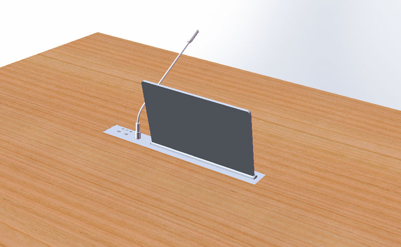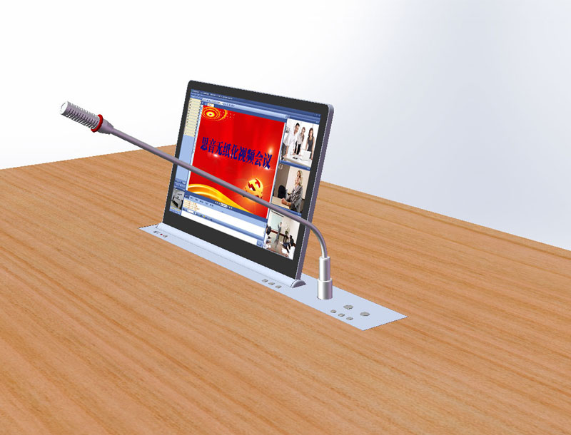 產品本身內置LED顯示屏,超薄機身和鋁合金精拉絲氧化面板結構,齒合式直線導軌傳動方式,機械防夾手設計,一體化機身防護,外觀無螺絲,產品使用安全可靠,美觀大方。外置VGA、DVI、HDMI等多重信號接口和RS232/485控制接口,產品在啟動時,液晶顯示屏升降器從箱體內部升出桌面并自動為顯示屏供電,產品設有智能仰角0-15°可調節角度功能,滿足各個人群的顯示屏仰角使用需要。當產品使用完成需要關閉時,顯示屏自動返回升降隱藏于箱體內部并自動斷開顯示屏電源,起到保護顯示屏并節約用電的作用。產品具有防盜、防塵、和保持桌面平整清潔,會議場所整齊有序等功能。本系列產品可按客戶要求定制。